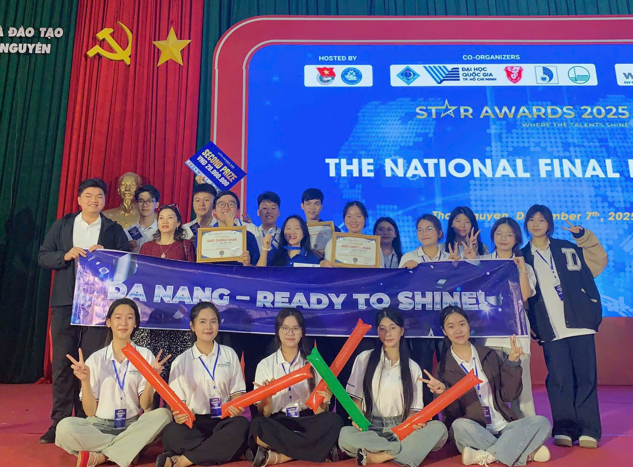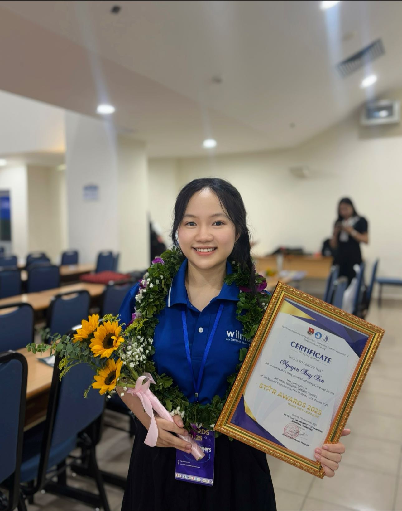 Vượt qua hàng trăm thí sinh xuất sắc trên khắp cả nước, Nguyễn Thủy Tiên, sinh viên, 23SPA01 Khoa Sư phạm Ngoại ngữ, Trường Đại học Ngoại ngữ, Đại học Đà Nẵng đã xuất sắc cùng đội Novaz mang về giải Nhì danh giá tại vòng chung kết cuộc thi tiếng Anh toàn quốc “Star Awards 2025”. Thành tích ấn tượng này không chỉ khẳng định năng lực ngoại ngữ vượt trội mà còn lan tỏa tinh thần đổi mới, hội nhập của thế hệ Gen Z Đà Nẵng.
