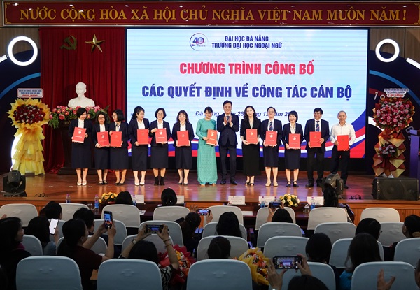 Chiều ngày 26/12/2025, Trường Đại học Ngoại ngữ, Đại học Đà Nẵng long trọng tổ chức Lễ công bố quyết định bổ nhiệm, bổ nhiệm lại 23 cán bộ quản lý đồng thời tuyên dương, khen thưởng các tập thể, cá nhân có thành tích xuất sắc năm 2025. Sự kiện mang ý nghĩa chiến lược, thể hiện rõ quyết tâm của Nhà trường trong việc kiện toàn bộ máy, nâng cao chất lượng nguồn lực, đáp ứng yêu cầu đổi mới giáo dục đại học