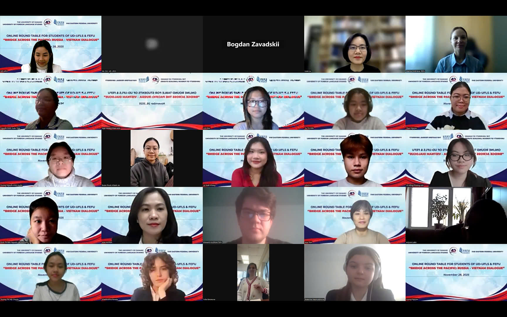 Sáng 28/11/2025, Trường Đại học Ngoại ngữ, Đại học Đà Nẵng (UD-UFLS) phối hợp cùng Đại học Liên bang Viễn Đông (FEFU), Liên bang Nga tổ chức buổi trao đổi chuyên môn trực tuyến với chủ đề “Bridge Across the Pacific: Russia-Vietnam Dialogue”. Sự kiện diễn ra trên nền tảng Zoom, quy tụ đông đảo cán bộ, giảng viên và sinh viên hai trường, đánh dấu bước ngoặt trong hợp tác học thuật quốc tế giữa UD-UFLS và FEFU.